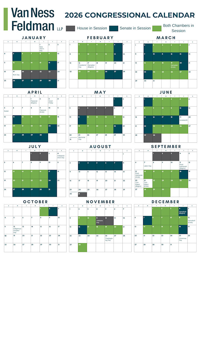 Van Ness Feldman's Government Advocacy and Public Policy Practice is pleased to offer the 2026 Congressional calendar, which provides a guide to this year's legislative sessions and key dates throughout the year.