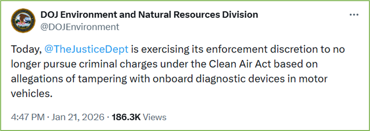 The Environment and Natural Resources Division (ENRD) of the U.S. Department of Justice (DOJ) posted on X on January 21, 2026, that it would no longer pursue criminal enforcement of CAA violations based on motor vehicle tampering allegations: